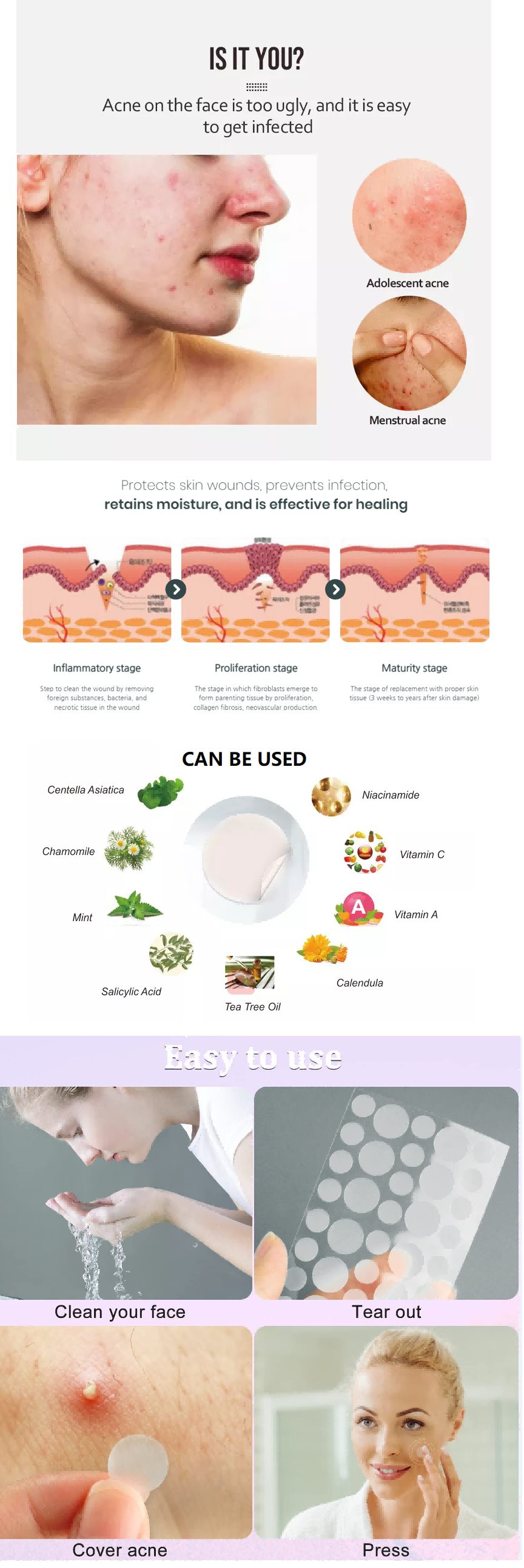 Pimple Master Patch es un hidrocoloide hidrofílico especial como materia prima principal, esta pasta de materia prima sobre el acné puede absorber las secreciones y ayudar a suavizar el acné. Y puede reducir la posibilidad de infección bacteriana, más adecuado para el acné inflamado.